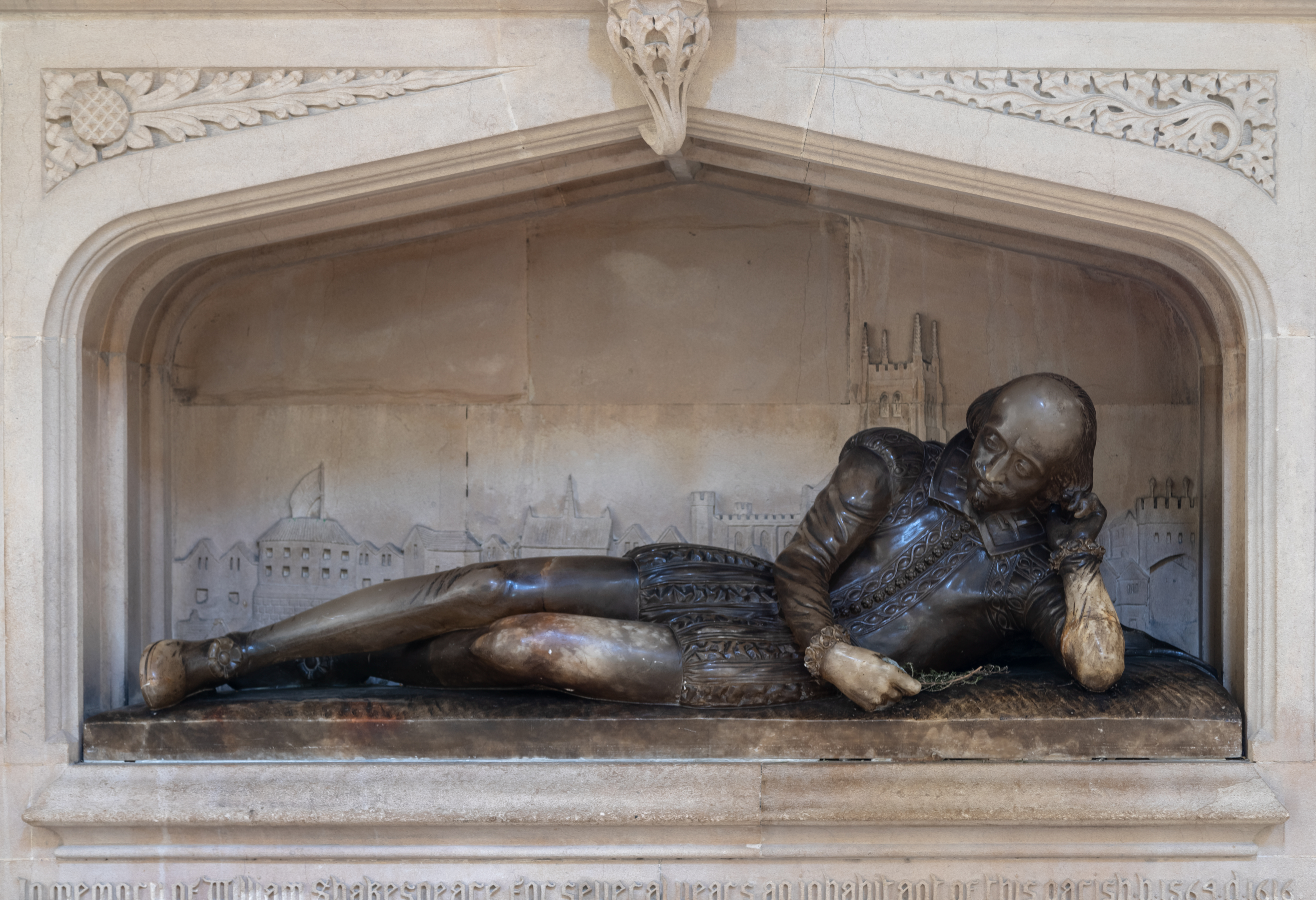 In the tracery at the top you can see Shakespeare’s shield of arms and a quotation from The Tempest.